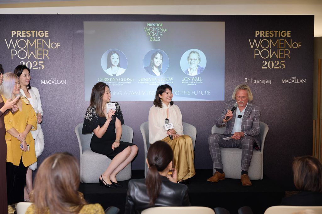 - Leading a Family Legacy into the Future, a panel discussion that featured Genevieve Chow, Chief Brands Officer & Executive Director of Chow Sang Sang Group, and Christina Chong, Director of Business Development at V-Mark Aviation Company, and was moderated by Jon Wall, Managing Editor, Prestige Hong Kong.